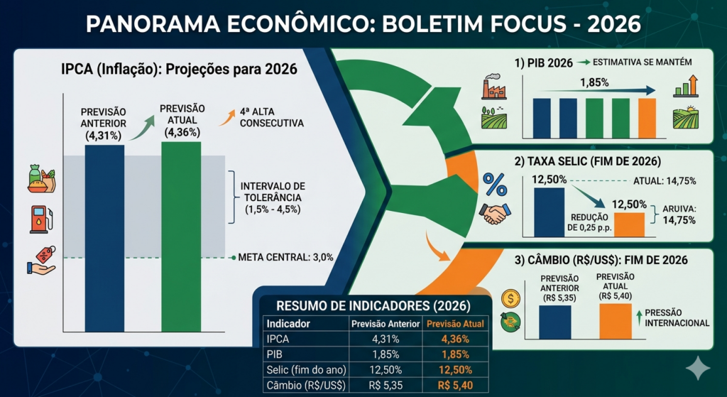 Estimativa para o crescimento da economia se mantém em 1,85% A previsão do mercado financeiro para o Índice Nacional de Preços ao Consumidor Amplo (IPCA), a inflação oficial do país, subiu de 4,31% para 4,36% para o fechamento de 2026. Os dados constam no Boletim Focus desta segunda-feira (6), levantamento semanal realizado pelo Banco Central […]