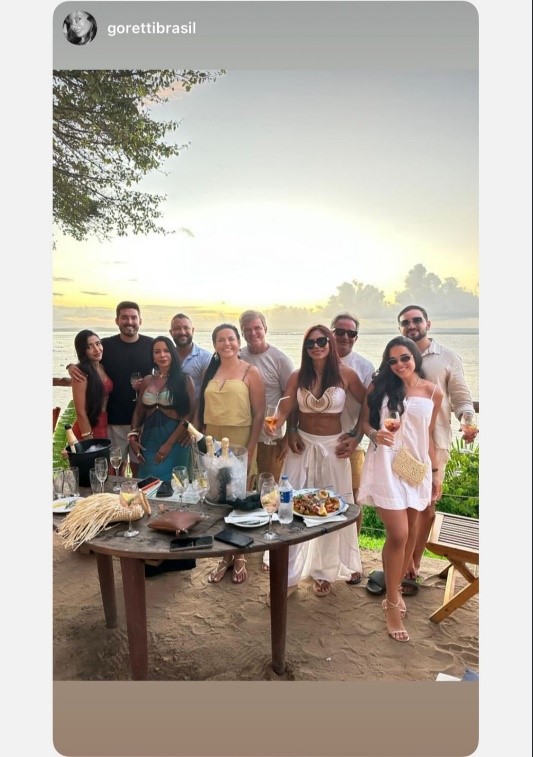 A Prefeita de Silva Jardim, Maira Branco Monteiro (ao centro, de amarelo), e seu esposo confraternizam na Bahia com o empresário Hudem Santana Faria A